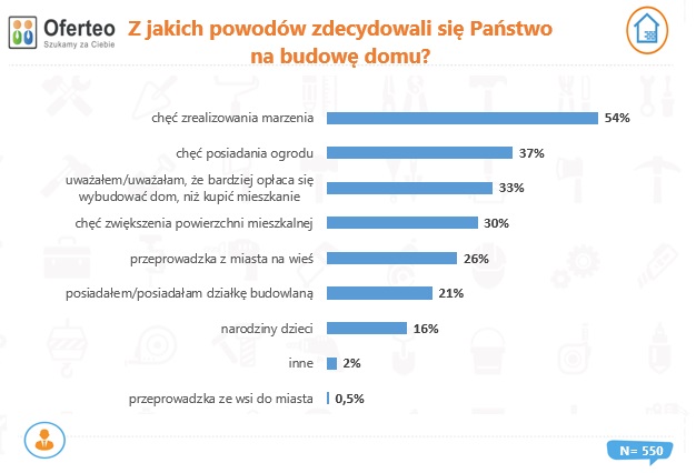 Uczestnicy badania zostali też zapytani o powody, jakie skłoniły ich do podjęcia decyzji o budowie własnego domu. Najczęściej wśród odpowiedzi pojawiała się chęć zrealizowania marzenia wskazana przed 54% badanych. 38% inwestorów zależało na własnym ogrodzie, a co trzeci chciał zwiększyć powierzchnię mieszkalną.