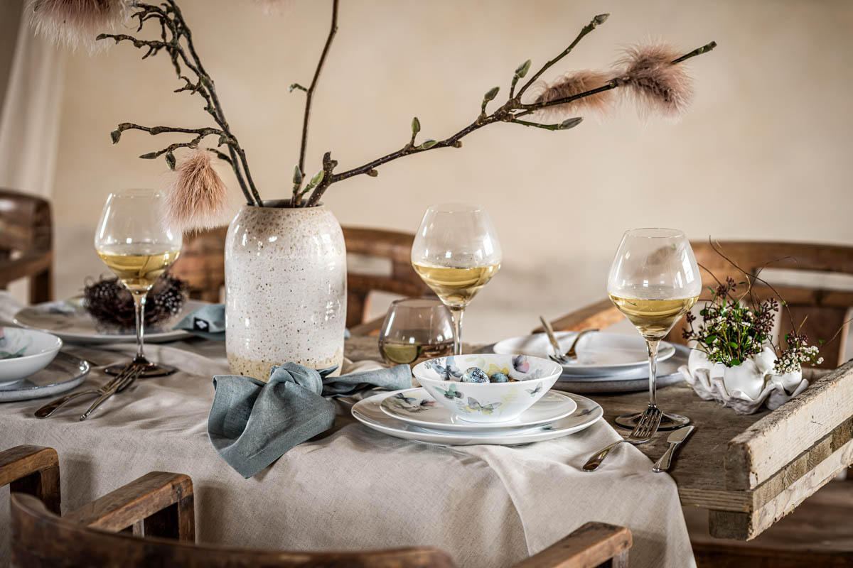 Dla miłośników jasnych aranżacji, o cudownie romantycznym charakterze, znakomitym pomysłem będzie porcelana VICTORIA – wytworna i ponadczasowa, udekorowana subtelnym wzorem, który wije się niczym jedwabna wstęga na białym tle. Wyjątkowość serwisu podkreślają połyskujące elementy z 18-karatowego złota. To serwis, z którym można tworzyć wspomnienia chwil spędzonych w towarzystwie ukochanych osób. Całości dopełnią smukłe kieliszki z tej samej kolekcji, lniane serwety w naturalnym odcieniu, białe świece i gałązki z baziami, ozdobione pastelowymi pisankami.