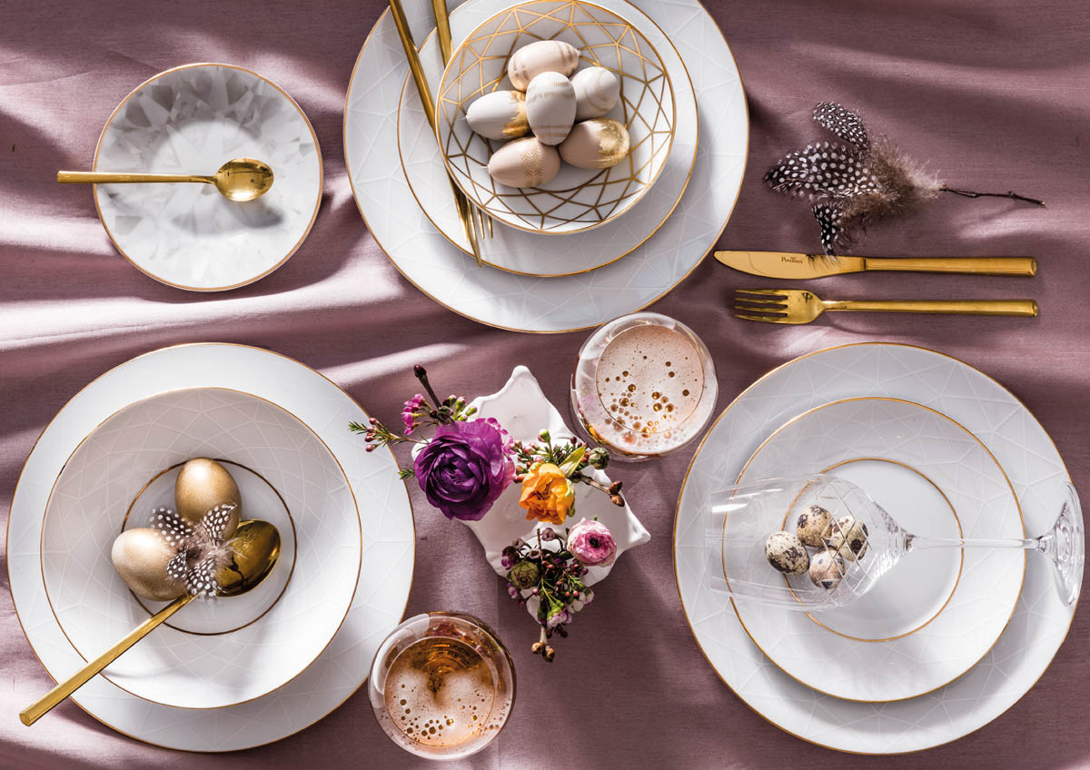 Stół wielkanocny mieniący się złotymi i diamentowymi detalami? Do takiej aranżacji najlepszym wyborem będzie porcelana DIAMOND, utrzymana w kolorze perły i srebrzystej bieli, na tle których niezwykły efekt tworzy wzór inspirowany diamentowymi szlifami. Wrażenie luksusu potęgują ręcznie malowane zdobienia z 18-karatowego złota. Wspaniałą kompozycję stworzymy stawiając te naczynia na naturalnym obrusie, w kolorze zgaszonego różu. Do tego złote sztućce i nieodzowne bukiety żółtych żonkili oraz fioletowych tulipanów.